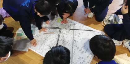 地域ごとのグループに分かれて、地図上の区役所・公園・病院などの公共施設や、地域の防災上の弱点となる場所にシールを貼っていきます。