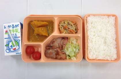 本日の献立は、鶏肉のてり焼き・ボイルキャベツ・かぼちゃのそぼろ煮・ごまあえ・プチトマト・米飯・牛乳です。
