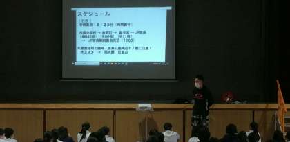 2年生は講堂で、校外学習に向けての事前学習です。校外学習は、自主性、規範意識、公共性、協力する気持ちなど、沢山のことを学習する良い機会になります。