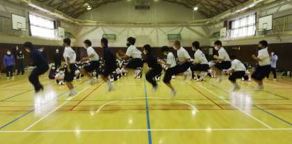 1年生は体育館で、7月にある泊行事に向けて、集団活動、仲間づくりの学習です。大縄跳びを通じて、人間関係が構築されていきます。