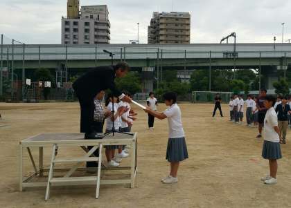 今朝の全校集会では、一昨日行われました、大阪市春季総合体育大会女子ソフトボールの部で、三位となったソフトボール部に、校長先生から賞状とメダルが授与されました。