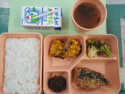 今日の給食のメインは、鯖の竜田揚げでした。なかなか良いお味でした。焼きトウモロコシが副菜でありました。シーズンには少し早いですが、甘くてとても美味しい一品でした。