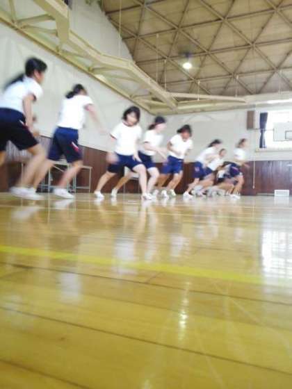 ♪ドレミファソラシド♪の音に合わせて、20mを何度も何度も往復する種目です。音階のスピードが徐々に速まるので、なかなかハードなテスト種目です。25年度の二年生の全国平均値は約57回で、このクラスの女子は94回が最高記録でした。