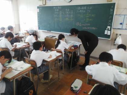 写真は1年3組の数学の【割合】の授業風景です。生徒達も緊張した面もちで、しっかりと授業に取り組んでいました。