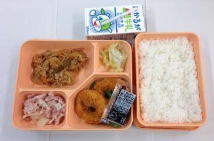 豚肉のケチャップソテー・いかリングフライ・ボイルアスパラガス・ジャーマンポテト・キャベツのピクルス・米飯・牛乳でした。