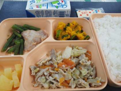 今日の給食は、蓋を開けた瞬間にまずキレイな彩りが目に飛び込んできて、食欲をそそられました。主菜はガーリック風味の豚の野菜炒めでしたが、なかなかいいお味でした。