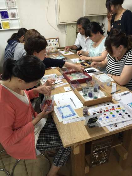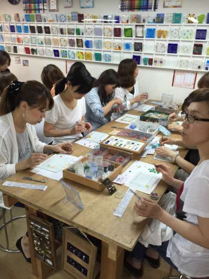 写真は、清水寺そばの『清水ガラス館』でフォトフレームorフットライト作りをしているところです。
