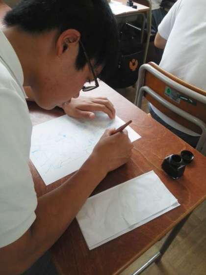 ペンとインクを使い、上手にペンを走らせていました。何よりも真剣な視線にびっくりしました。気分はマンガ家かイラストレーターだったんじゃないでしょうか?