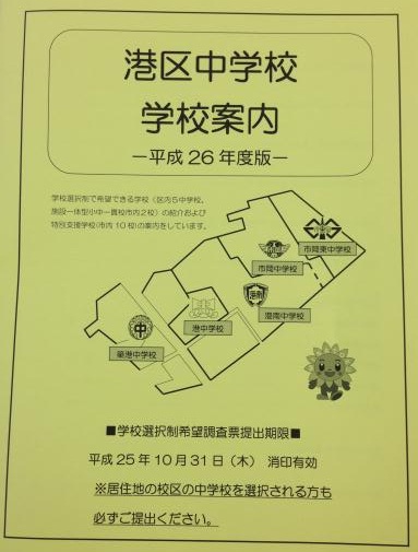 すでに、6年生児童の家庭へは、港区役所から「港区中学校学校案内−平成26年度版−」等が届いています。