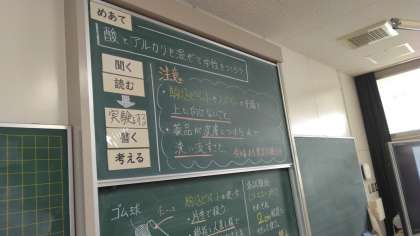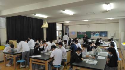 理科の研究授業では、酸とアルカリを混ぜた時の中和反応の実験をしています。