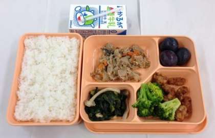 豚肉のごまみそ炒め・たこのから揚げ・ボイルブロッコリー・チンゲンサイの煮びたし・ぶどう(ピオーネ)・米飯・牛乳