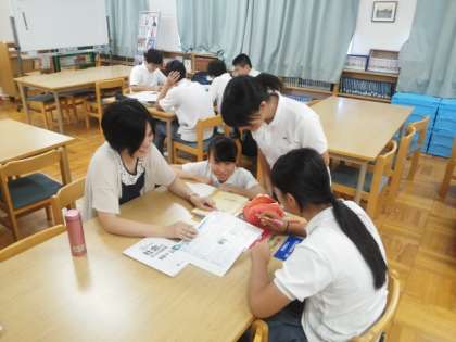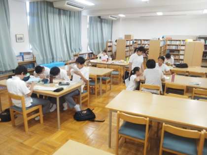 写真は2年生が図書室で社会の勉強している様子です。熱心に質問していました。