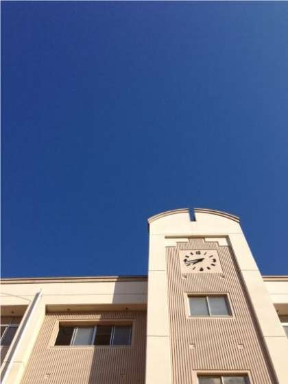 携帯電話の「SmartNews」を見ると、今日は「空の日」だそうだ。2号棟のある大時計(写真)の上空は雲ひとつなく青空が広がっています。