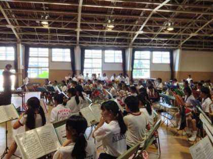 本日は、市岡中学校の講堂で4校の吹奏楽部が集まり合同練習が行われました。暑い中、汗だくになりながら練習をしました。総勢140名ほどの迫力のある演奏!と思いきや、まだまだ練習が足りず、できていない部分も多くあります。