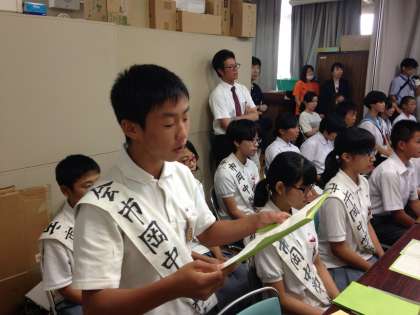 パワーポイントを使ったり、活動の様子をまとめた動画を流したり、どこの生徒会も創意工夫したやり方で発表します。市岡中学校の生徒会はこの日のために夏休みを使って作成した冊子を配布し、活動の様子の写真をスクリーンに映して発表しました。