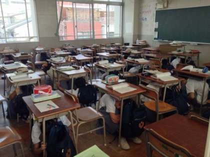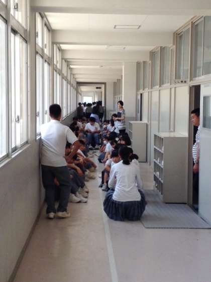 今日は、11:00に大阪府下一斉の「880万人避難訓練」が実施されました。本校でも、地震への対処行動(写真上)や、地震後の「大津波警報」を受けての避難行動を訓練しました。津波に対しては、3階以上の建物に避難するために、2年・3年は教室が2階のためそれぞれ授業を行っていた教室から3階、4階の廊下へ移動(写真下)しました。11月頃にももう一度訓練を実施する予定にしております。