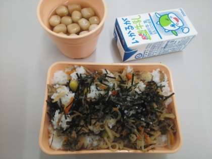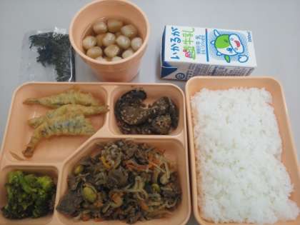 今日の給食は、牛肉のきんぴらちらし、いわしてんぷら、、なすのそぼろ炒め、ブロッコリーの甘酢和え、すまし汁でした(写真左)。この中で、牛肉のきんぴらちらしに刻み海苔を振りかけると、右側の写真の混ぜご飯になりました。なかなか美味しい一品となりました。