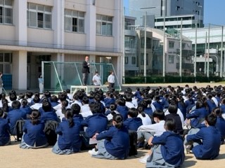 入部する生徒はグラウンドに集合し、部活動総会が行われ、校長先生、部活動担当の先生より、お話がありました。