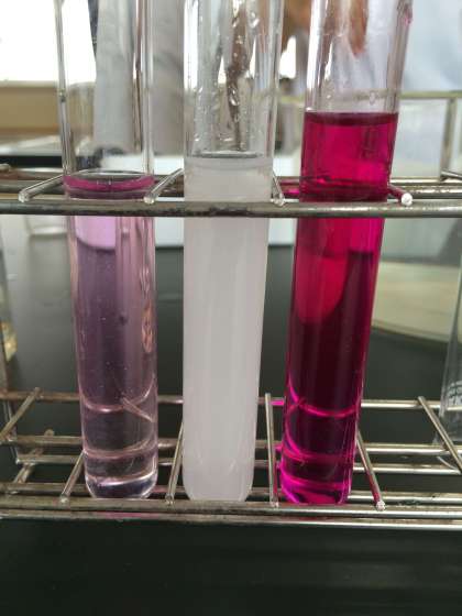 実験の中身は、『炭酸水素ナトリウムを加熱すると炭酸ナトリウムと二酸化炭素と水に分解される実験です。また反応前の炭酸水素ナトリウムと反応後の炭酸ナトリウムが同じ物質が違う物質に変化したのか確かめる実験も行われていました。ちなみに、試験管の写真は左から炭酸水素ナトリウムによって弱アルカリ性を示して薄いピンク色になったもの、石灰水が発生した二酸化炭素によって白く濁ったもの、炭酸ナトリウムによって強アルカリ性を示して赤紫色になったものです。』………文字で書くと難しい実験ですね…、昔習ったはずやのに……。