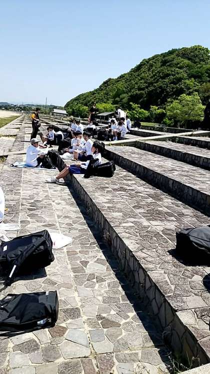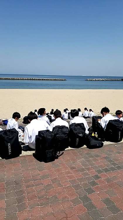 浜辺でクラス写真を撮り、昼食を食べています。