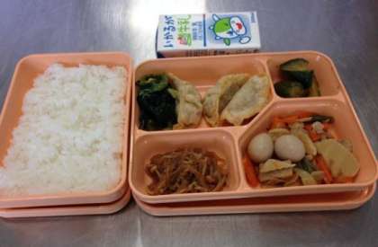 揚げギョーザ・チンゲンサイの炒めもの・うずら卵と野菜の中華煮・えのきたけと糸こんにゃくの炒めもの・きゅうりの中華あえ・米飯・牛乳です。