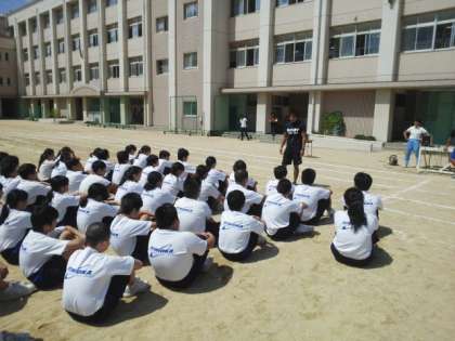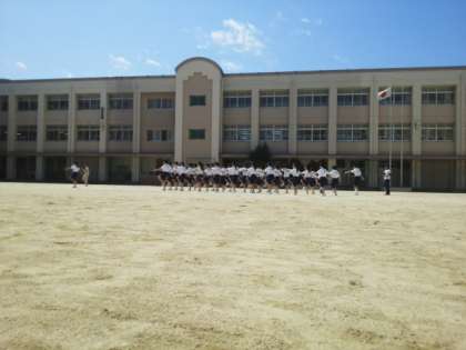 四限目の1年生の体育です。最近の天気の中で一番暑かったにもかかわらず、生徒達は元気に行進練習を行っていました。1年生のとっては初めてのグランド練習で、音楽に合わせての四列縦隊行進をなかなか綺麗に揃えられませんでしたが、三回目の行進練習では、この日一番の行進を見せてくれました。自分のペースで歩くことは簡単ですが、集団としてまとまって揃えて歩くためには、音楽をしっかり聴き、人を意識してリズムを合わせて行進する必要があります。意識して練習に臨めばこれからもっともっと上達します。本番を目指してクラス一丸となり頑張れ!!