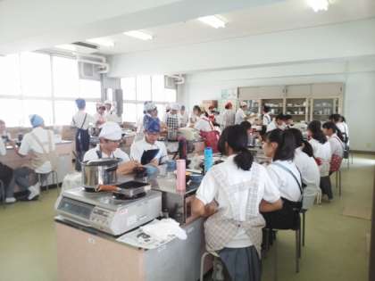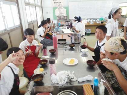 調理室では2年生が豚汁と出汁巻き卵を作っていました。なかなかの味にに仕上がったのか、みんな美味しそうに食べていました。