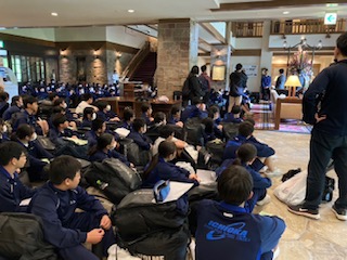 本日の宿泊ホテル、白馬東急ホテルの入館式が終わりました。豪華なホテルに生徒たちは驚いています。