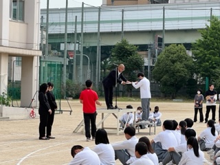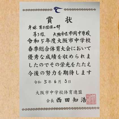 6月3日に行われた大阪市春季総合体育大会にて、卓球部男子が団体の部で第3位となり、賞状伝達が行われました。