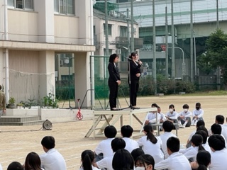 先週末の大雨とはうって変わって、晴天のもと、全校集会が行われました。