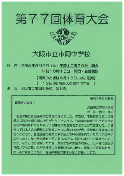 また、一部の生徒においては、会場および用具準備のため、早めの登校を指示しておりますことをお知りおきください。