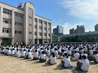 梅雨の合間の晴れ間のもと、全校集会が行われました。
