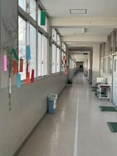 1年生の廊下を歩いていると、各教室の前に、笹が飾られていて、願いが込められた短冊がついていました。