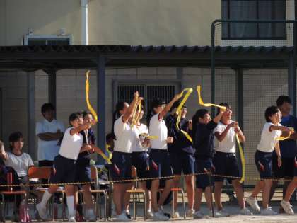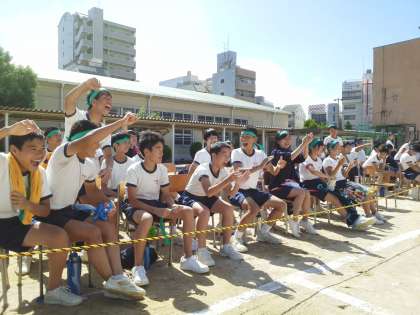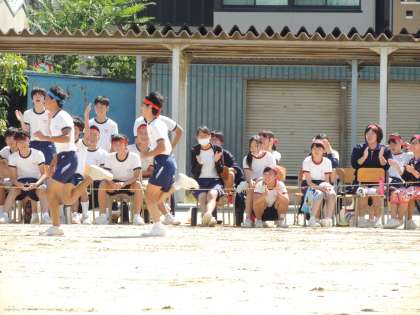応援の光景です。学年が上がれるにつれて、またプログラムが終盤になるにるつれて、応援に熱がこもっていきました。競技者と応援者が一体となった雰囲気は、とてもすがすがしい光景でした。