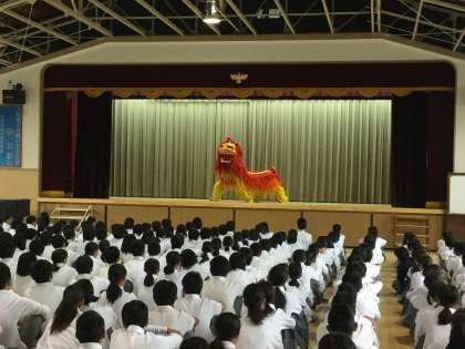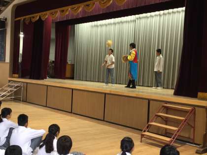 プログラムの中に生徒も参加できる中国雑伎チャレンジコーナーもあり、先生も参加し講堂は笑いに包まれました。