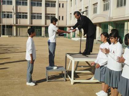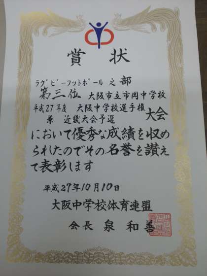 今朝は全校集会があり、まず先週末に府秋季大会で3位になったラグビー部に、表彰状が授与されました。