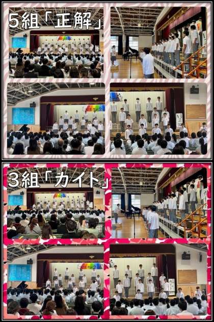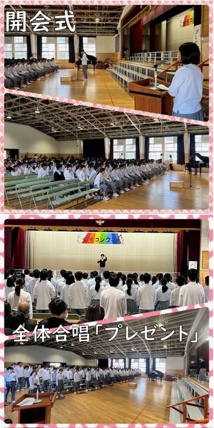 各クラスの発表の前に、3年生全員でうたった課題曲「プレゼント」が披露され、期待度が高まる中、合唱コンクールがスタートしました。