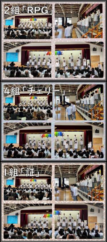 自由曲は、発表順に、2組「RPG」⇒4組「チェリー」⇒1組「証」⇒5組「正解」⇒3組「カイト」です。