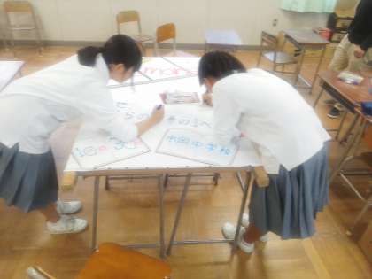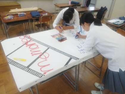 写真は、2年生の文化委員が文化祭の立て看板を作製してくれている様子です。