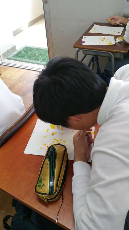 文化祭展示品制作(2年) 10/23 公開日 2015/10/23 更新日 2015/10/23 お知らせ 2年生は、文化祭で「ドット絵」を展示する予定です。 写真をモチーフにして、各クラスでそれぞれの絵を制作しています。 自分に割り当てられた絵に、色を付けていきます。ただし自分に割り当てられた絵だけでは、まったく意味がわかりませんが、みんながそれぞれに色を付けた絵を並べると、1枚の絵が完成します。何の写真をモチーフにしたのかは、是非当日絵をご覧頂き、ご確認ください。出来栄が楽しみです。 いいね(0)