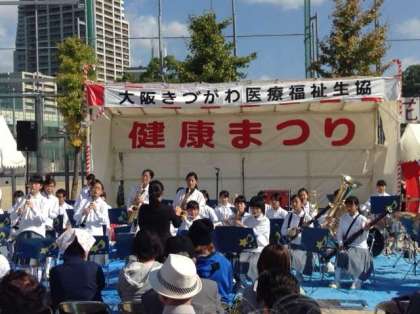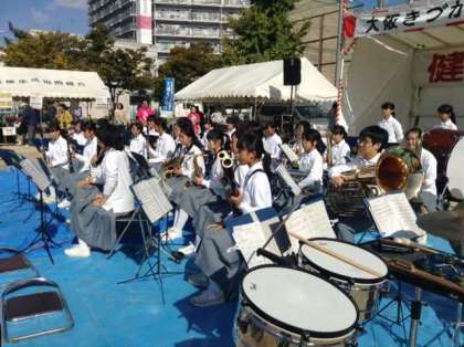今日は、市岡中学校のすぐ近く、磯路中央公園で開催されています健康まつりに吹奏楽部が出演しました。オープニングの演奏として、ファンファーレの後に6曲演奏しました。
