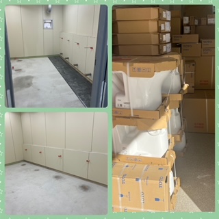 明日あたりから、壁紙が貼り付けられる予定で、廊下には、新たに取り付けられる洋式便器が並べられています。