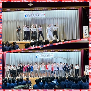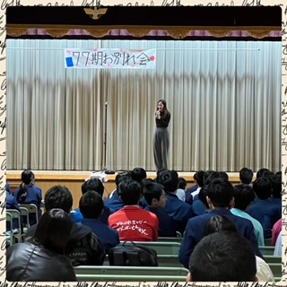 第3学年 お別れ会 公開日 2024/03/07 更新日 2024/03/07 学校行事 午前中の厳粛な雰囲気からはガラリと変わり、午後からは、有志の生徒が企画したお別れ会が開かれています。 中盤にお邪魔してみると、ダンス部によるかっこいいダンスが舞台で披露されていました。 たくさんの笑顔が広がっていました。 そして、英語の時間にお世話になったC-NETのミン先生より、77期生に向けてメッセージが送られました。 いいね(0)