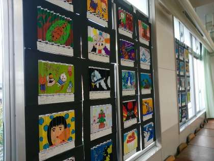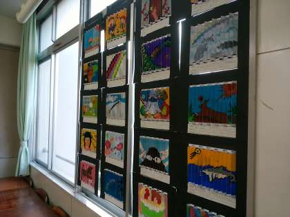 2年生の美術の作品です。この不思議な絵、「2枚絵」と言うそうです。上と下は同じ1枚の絵なのですが、左右からみるとそれぞれ違った絵に見えます。楽しい絵ですよね。