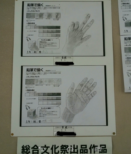 毛筆は、どのクラスも異なるお手本を元に、勢いのある字を大胆に書き上げ、また手のデッサンでは、鉛筆の特徴を使って、陰影を上手につけ描き上げていました。