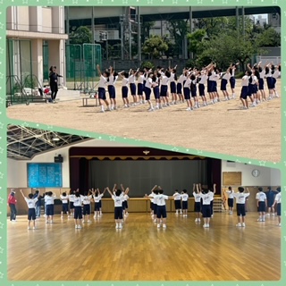 1・2組は体育で、男子講堂・女子グラウンドにてラジオ体操第2の練習をしていました。