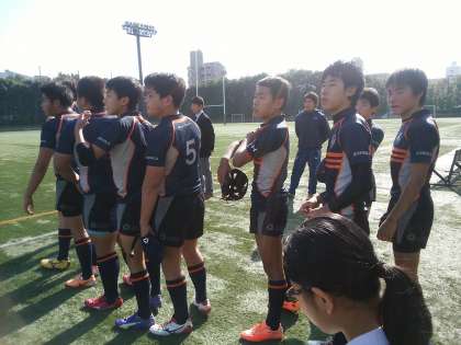 試合は、前半から相手のパワー・スピードに押され、マイボールになっても相手の素早い出足やプレッシャーで反則を重ねるなど劣勢を強いられました。しかし、市岡の選手達は相手の大柄な選手にもひるむことなく、低い姿勢からの強烈なタックルで倒すなど、相手の攻撃を幾度となく跳ね返す「ナイスファイト」を見せ続けてくれました。