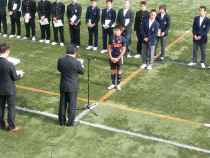 ラグビー大阪市秋季大会4 11/21 公開日 2015/11/21 更新日 2015/11/21 お知らせ この決勝戦では、本校の放送部が、試合中のウグイス嬢を務め、試合前の選手紹介や試合中の反則の説明をアナウンスするなど、見事大役を果たしてくれました。(写真上) 尚、この大会において、村上君が優秀選手に選ばれました。(写真中) また、決勝戦の前には、女子のラグビー(セブンズ)に1年の今村さんが合同チームで出場し、トライを決める活躍を見せてくれました。(写真下) いいね(0)