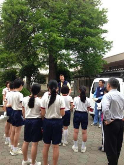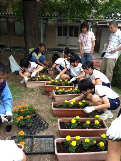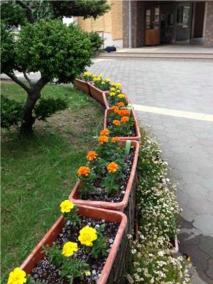 5月27日(月)の放課後に生徒会委員6名とボランテイアを申し出てくれた4名の生徒と、校長先生・教頭先生・花谷先生・下迫田先生・増本先生とで、マリーゴールド80株の鉢植えを行いました。