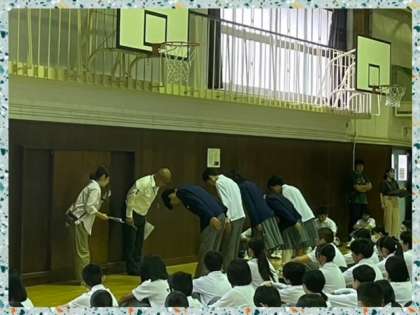 今週の全校集会は、朝からの雨でグラウンドの状況が悪かったため、体育館で行いました。